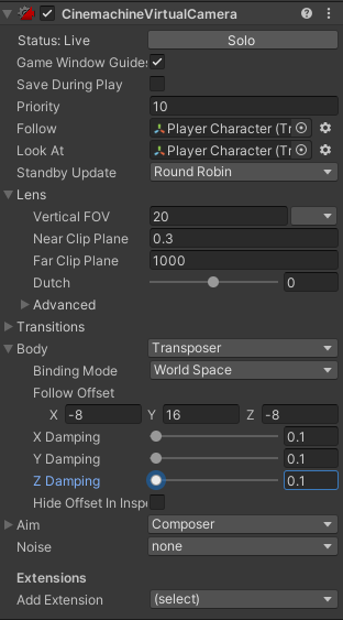 - Follow 와 Look At에 플레이어 캐릭터 할당