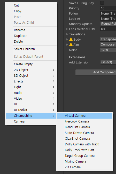5-2. 하이어라키에서 Cinemachine → Virtual Camera 추가