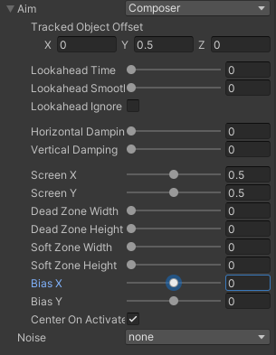 - 데드존, 소프트존, 하드리밋 설정 - 데드존 : 화면의 하얀부분 : 카메라가 주시하는 물체가 데드존에 있으면 카메라의 에임이 맞는 것(카메라가 회전하지 않음) - 소프트존 : 화면의 하늘색 부분 : 물체가 데드존을 벗어나 소프트 존에 있다면 카메라가 부드럽게 회전해 에임에 오도록 맞춘다 - 데드존 : 화면의 빨간 부분 : 물체가 데드존에 위치하면 많이 벗어났으니 카메라가 급격히 회전해 에임에 오게 맞춘다